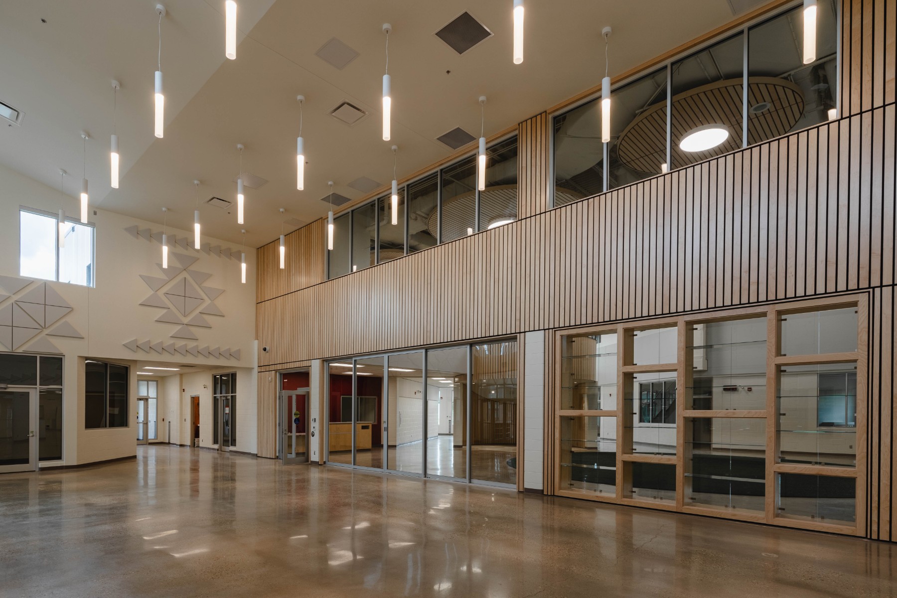 We completed a new highschool in Big Stone Cree Nation. This new 77,500 sq. ft. facility features an industrial kitchen for life skills like dressing game meat, specialized classrooms, and a drop off area.