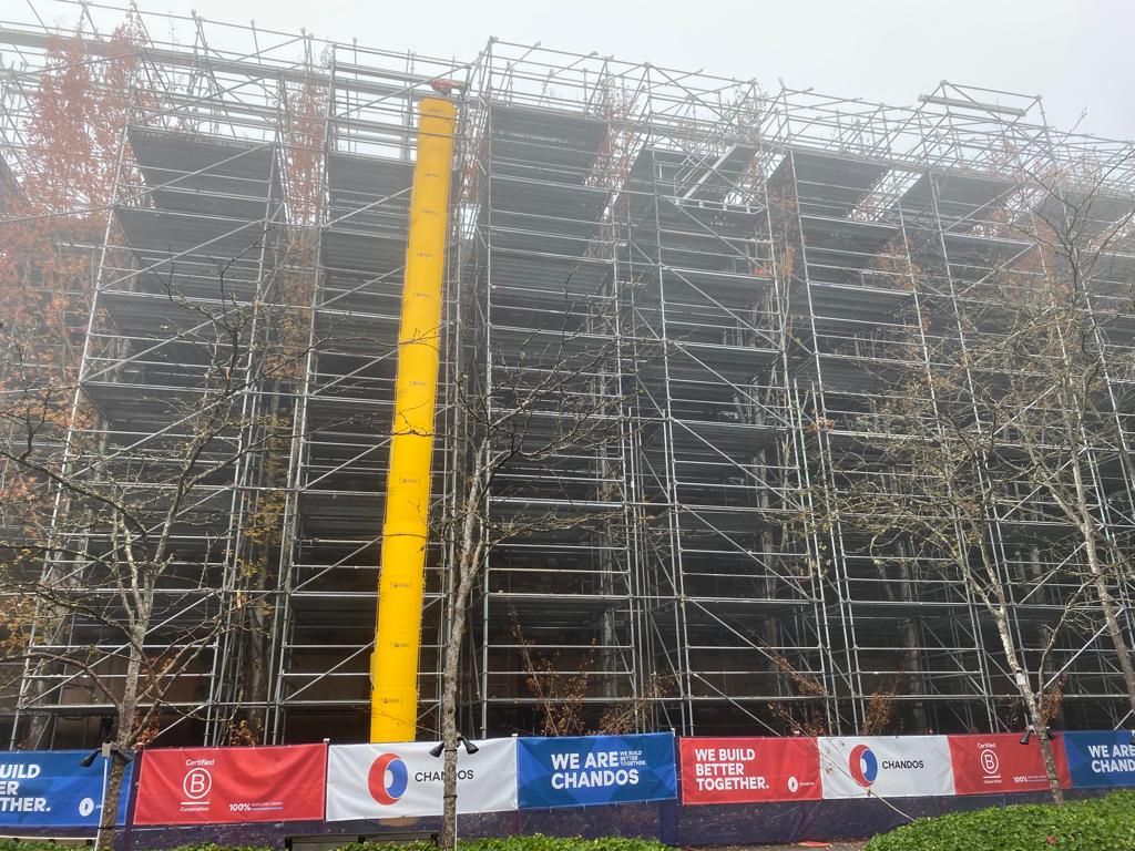 Safety was prioritized for both our team and the building occupants. We erected eight-foot-tall hoarding around the site before construction began. Additionally, we collaborated with our scaffolding partners to install scaffolding tunnels with crash decks covering 50 p/sf to ensure the safety of pedestrians nearby. We also installed netting along the facility perimeter as secondary safety measures.