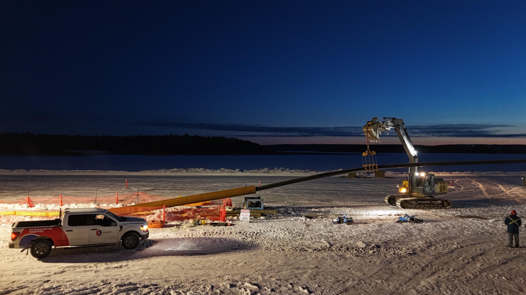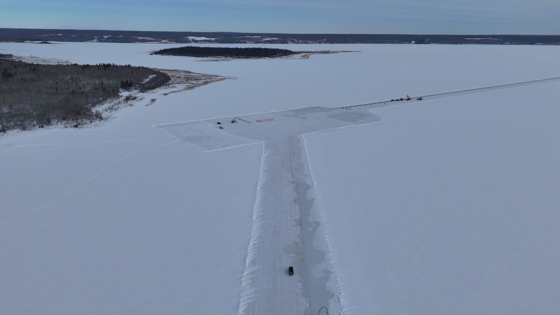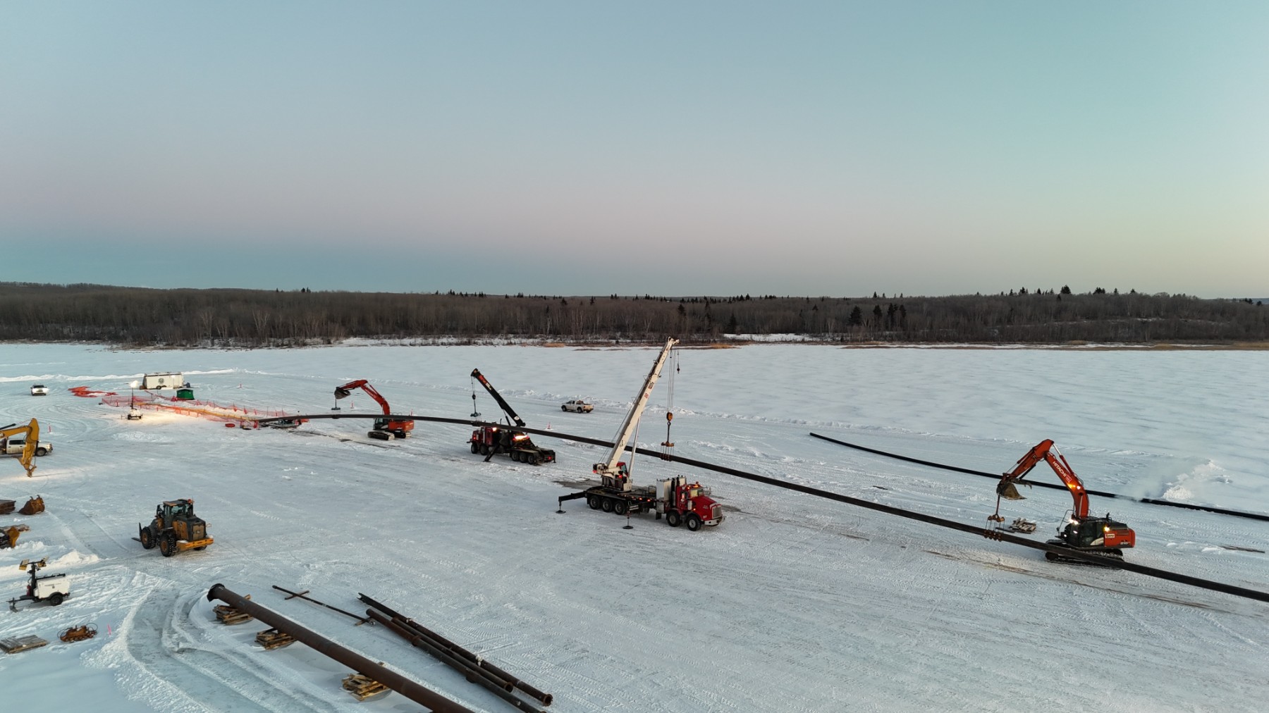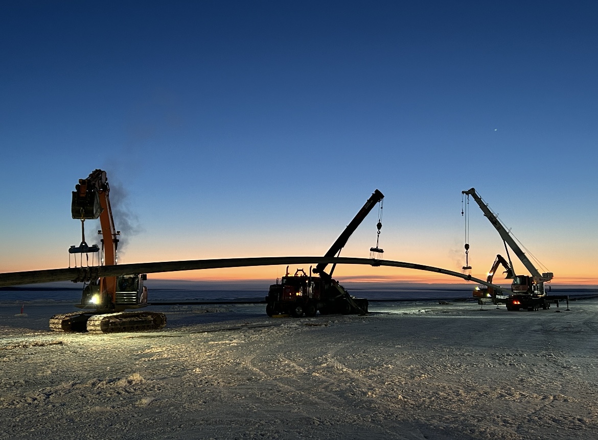 Construction includes a 1.1-kilometer raw water intake line and a 15-metre-deep pump station. Water will travel from the intake point to raw water storage ponds and a new treatment facility before being distributed back into the Nation. Key elements of the intake installation will be delivered using a large directional drill and supported by underwater divers. To overcome challenges posed by the remote location and facilitate drilling operations for the new raw water intake, an ice road was built to transport equipment onto the frozen lake. Additionally, an ice platform was constructed to receive the drill’s pilot bit and stage the intake pipe for final pullback, making timing and coordination critical to project success.